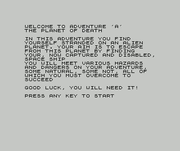 Planet of Death, as the title suggests, is yet another escape-the-alien-planet-in-your-presently-disabled-ship story, but it's pleasantly executed in the classic two-word parser style, with some interesting puzzles and a colorful sense of fantasy. If you plan to play the game yourself, which I always encourage, be aware that there's no in-game SAVE command; only when we QUIT are we given the option of saving. It's a cumbersome approach, given that there are several deaths and dead ends that are impossible to anticipate, so I recommend taking advantage of modern times, and playing on an emulator with save state capability.