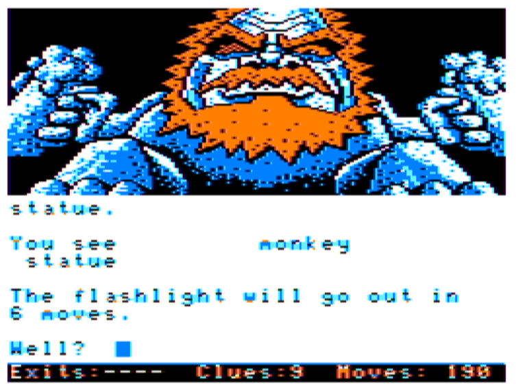 I remember playing this when it first came out. I got stuck at the cannibal scene. There was no Google back then. I spent days and days trying to figure out what i needed to do without any success. I was just about to throw the computer out the window when I angrily pressed the reset button half way. The computer hung up displaying indecipherable machine code and the words, "wave ring". Without that error I would still be in front of my Trs-80, 30 years later cursing the screen trying every verb in the dictionary over and over.