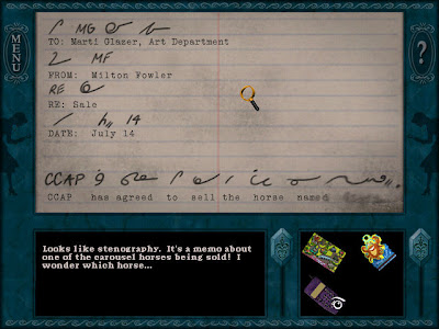 Nancy Drew #8: The Haunted Carousel was a lot more fun and challenging than I expected it to be. Its find-this-and-talk-to-him-or-her structure is a bit limiting, but the unfolding mystery is well-developed and the game's world worth exploring. I'm not planning to play through the entire Nancy Drew game series any time soon, or in release order -- I've started with number 8, as it happens, and HER Interactive has now published more than twenty such games -- but this won't be my last foray into Nancy Drew's interactive world.
