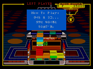The player has a small collection of 25 slots to work with, and must stack colored tiles to create horizontal, vertical and diagonal rows of matching tiles. The player must actively catch and flip the incoming tiles into place -- no just letting them fall, as there's a drop meter and too many fumbles result in a lost credit. We can also accelerate the movement of the tiles to speed up play when we think we can take it, and we can stack the tiles in last-in-first-out order on the "catcher" to make adjustments on the fly, up to a point. Scores correspond to the difficulty of the row formed -- verticals are easy, as we can just dump the tiles into the same column; horizontals are more difficult as we have to plan ahead a bit; and diagonals are the most difficult, especially when we have to form a number of them in a Diagonal Wave.